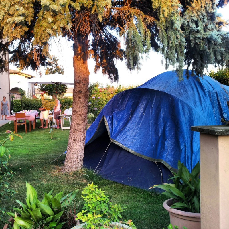 Quando sono arrivato la vista che mi ha colpito, che poi è stata quella che ho fotografato, è appunto quella che vedete sotto: una tenda montata in giardino, e una enorme tavola piena di ogni ben di dio a fianco.