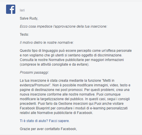 Dal momento che non rispetta le nostre Normative pubblicitarie, che si applicano ai contenuti di un’inserzione, al suo pubblico e alla pagina di destinazione a cui rimanda, la tua inserzione non è stata approvata. Non sono consentite inserzioni che contengono volgarità, che fanno riferimento alle caratteristiche delle persone che le vedono (ad es. razza, etnia, età, orientamento sessuale, nome) o che le infastidiscono.