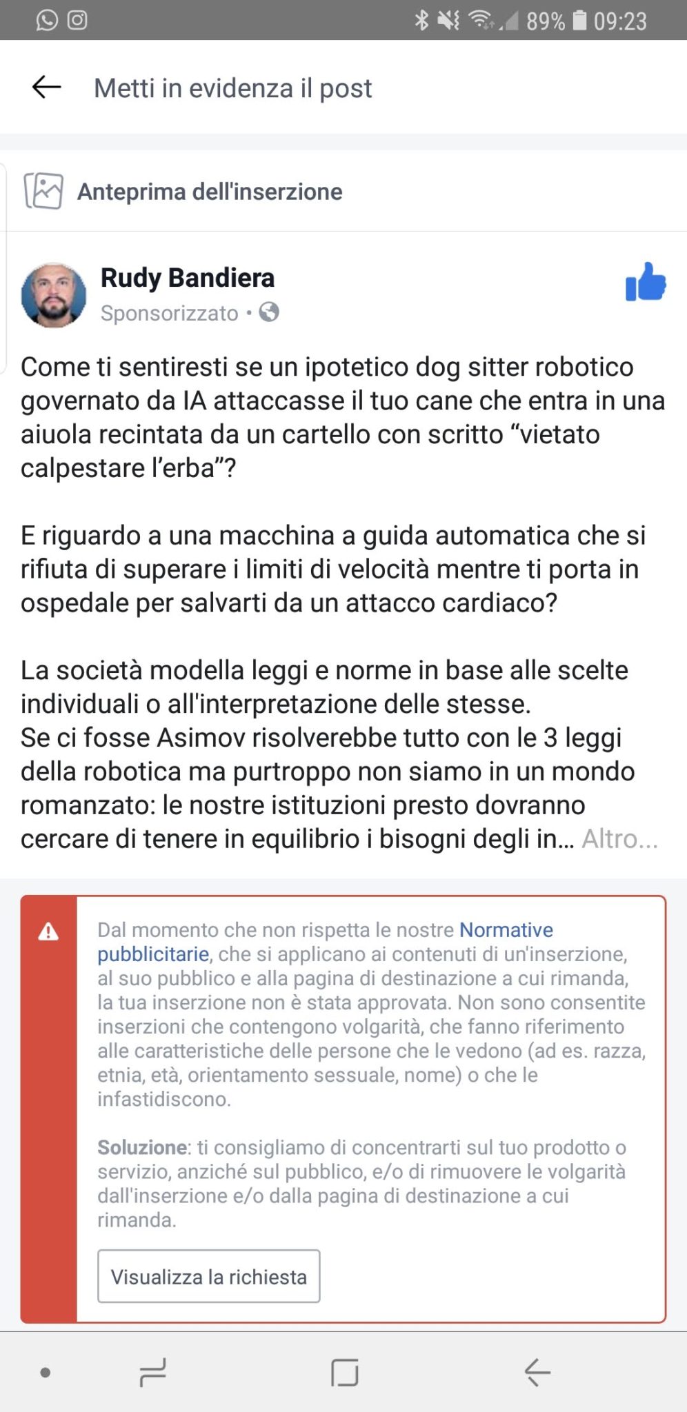 Un post che parla di etica ed intelligenza artificiale. Subito dopo la pubblicazione ho sponsorizzato con 10 euro come faccio spesso, per mantenere viva la fan base. Dopo pochi minuti mi arriva una mail con scritto la seguente frase: